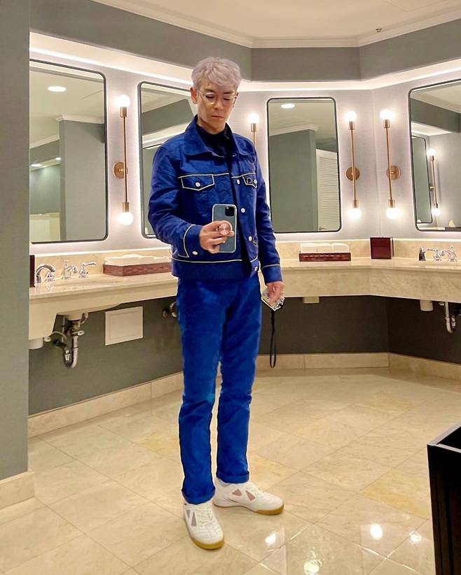 공개된 사진 속 탑은 화장실에서 거울셀카를 찍는 모습이다. 흰색으로 탈색한 그의 머리와 파란색으로 의상이 팬들의 관심을 모으고 있다.