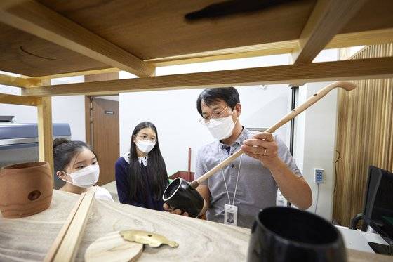 김나윤 학생기자가 “국악에는 정악과 민속악 두 종류만 있나요?”라고 질문했죠. “최근에는 창작 국악이라고 해서 현대 음악, 현대적인 작곡법에 의해 만들어진 창작곡이 있어요. 이날치의 ‘범 내려온다’라든지 국악 관현악과 국악 오케스트라 이런 것들이 창작 국악에 해당할 수 있죠. 정악‧민속악‧창작 국악 크게 세 가지로 보면 될 것 같아요.” 이서정 학생모델이 그럼 국악이 중요한 이유가 무엇인지 묻자, 이 팀장은 우리말 한글이 있듯 음악에도 우리 것이 있는 거라고 생각하면 좋을 것 같다고 했죠. “우리만의 슬픔과 기쁨, 한스러운 감정을 음악적으로 풀기에는 국악만 한 게 없습니다. 현대 음악이 많이 나오고 있지만 그 밑바탕에는 우리 것을 잃지 않고 가지고 왔던 국악이 있기 때문에 가능했다고 생각합니다.” 궁금한 점을 해결하고 자리를 이동하니 깜찍하고 우아하게 생긴 해금도 보였습니다. 소리가 아름다워 요즘 해금 연주하는 사람도 많다는 얘기에 이서정 학생모델이 초등학교 1학년 때부터 해금을 배우고 있다고 밝혔죠. 두드리는 타악기를 모아놓은곳에서는 우리가 흔히 알고 있는 북‧장구‧징‧꽹과리 등을 살펴봤습니다.
