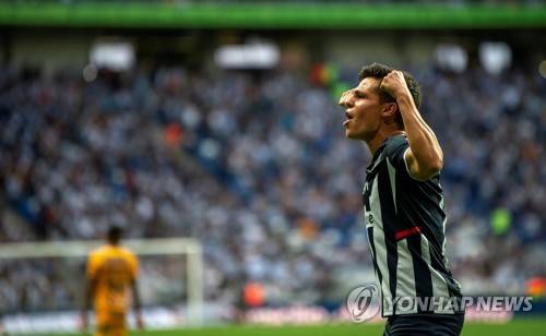 epa09477354 Monterrey's Alfonso Gonzalez celebrates after scoring against Tigres UANL during the Liga MX 2021 Apertura Tournament soccer match between Monterrey and Tigres UANL at the BBVA Stadium in Guadalupe, Greater Monterrey, Mexico, 19 September 2021. EPA/MIGUEL SIERRA