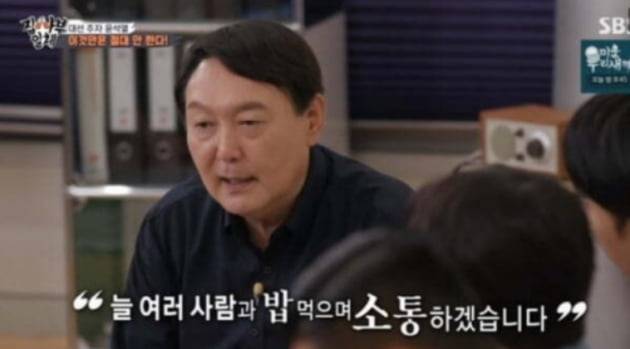 윤 전 총장은 이날 방송된 '집사부일체'에서 "대통령이 된다면 점심 저녁은 절대 혼밥(혼자 밥 먹기)하지 않고 숨지 않겠다"고 말해 우회적으로 문재인 대통령을 저격했다.