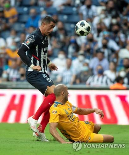 epa09477355 Monterrey's Rogelio Funes Mori (top) in action against Tigres UANL's Guido Pizarro (bottom) during the Liga MX 2021 Apertura Tournament soccer match between Monterrey and Tigres UANL at the BBVA Stadium in Guadalupe, Greater Monterrey, Mexico, 19 September 2021. EPA/MIGUEL SIERRA