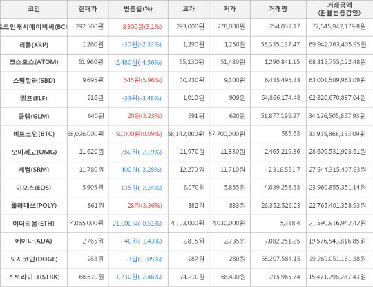 하락세를 보이는 가상화폐는 총 10종목으로 이 중 가장 큰 하락세를 보이는 코스모스는 전일 대비 -4.56% 하락한 51,960원에 거래되고 있다.