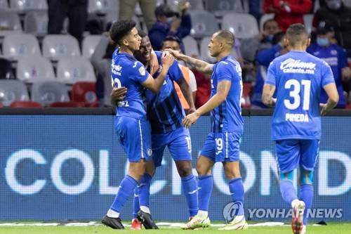 epa09477359 Cruz Azul's Bryan Angulo (C) celebrates with his teammates after scoring against Queretaro during the Liga MX 2021 Apertura Tournament soccer match between Cruz Azul and Queretaro at the Azteca Stadium in Mexico City, Mexico, 19 September 2021. EPA/Carlos Ramirez