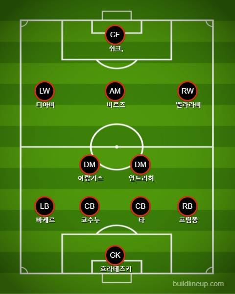 이 경기에서 레버쿠젠은 4-2-3-1 포메이션을 가동했다. 파트릭 쉬크가 최전방 원톱 공격수로 나섰고, 비르츠를 중심으로 무사 디아비와 카림 벨라라비가 좌우에 서면서 이선 공격 라인을 형성했다. 샤를레스 아랑기스와 로베르트 안드리히가 더블 볼란테(두 명의 수비형 미드필더를 지칭하는 포지션 용어)를 구축했고, 미첼 바케르와 제레미 프림퐁이 좌우 측면 수비를 책임졌다. 오딜론 코수누와 요나단 타가 중앙 수비수로 선발 출전했고, 골문은 루카스 흐라데츠키 골키퍼가 지켰다.
