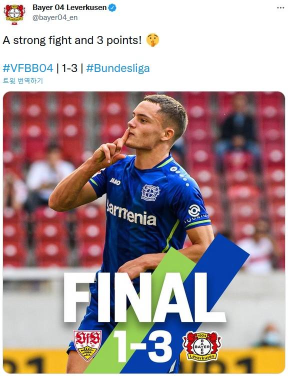 레버쿠젠이 메르체데스-벤츠 아레나 원정에서 열린 슈투트가르트와의 2021/22 시즌 분데스리가 5라운드에서 3-1 완승을 거두었다. 이와 함께 레버쿠젠은 지난 주말 보루시아 도르트문트전 3-4 패배를 씻어내고 3승 1무 1패 승점 10점으로 분데스리가 4위에 올라서는 데 성공했다.