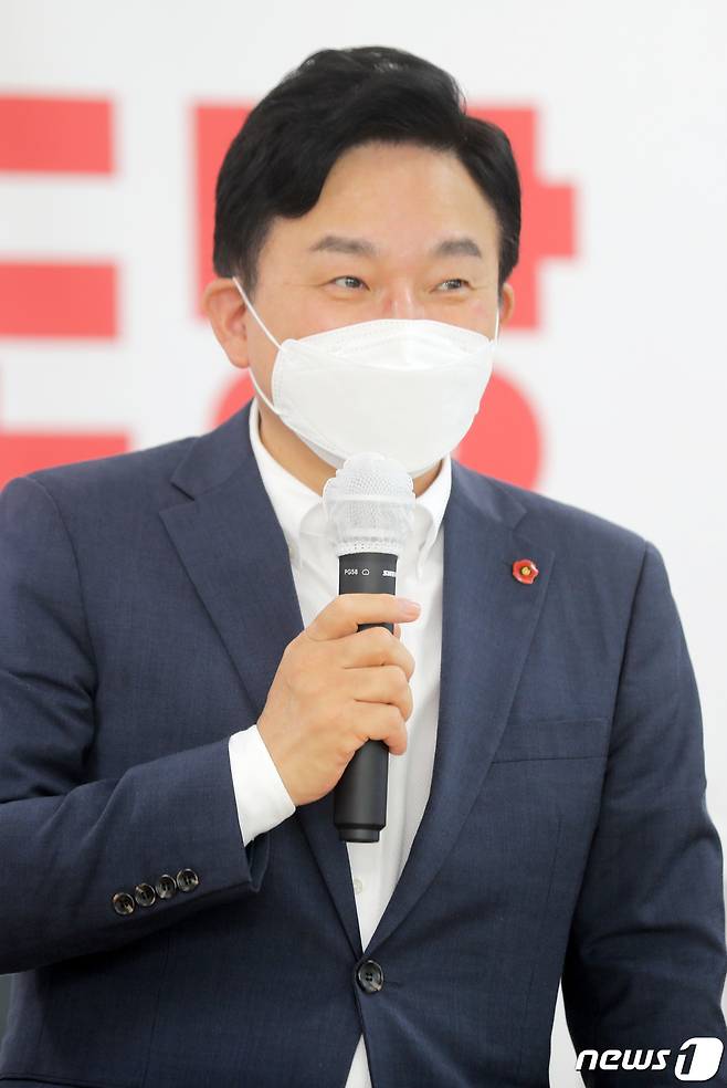 (제주=뉴스1) 오미란 기자 = 국민의힘 대선 경선 후보인 원희룡 전 제주도지사가 20일 오전 제주시 연동 국민의힘 제주도당 회의실에서 기자간담회를 하고 있다.2021.9.20/뉴스1
