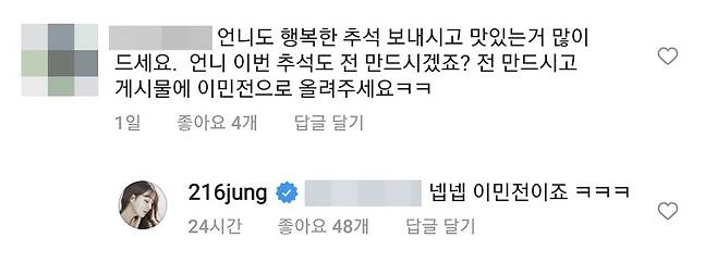 한 누리꾼은 이민정의 게시물에 "언니 이번 추석도 전 만드시겠죠? 전 만드시고 게시물에 이민전으로 올려주세요ㅋㅋ"라는 댓글을 남겼고, 이민정은 "넵넵 이민전이죠 ㅋㅋㅋ"라고 답했다.
