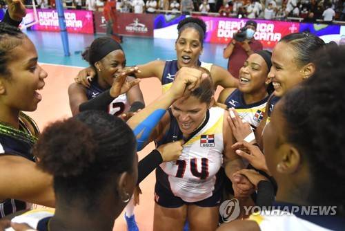 epa09477386 Players from the Dominican Republic celebrate after defeating Mexico in the Women's Volleyball Pan American Cup, in Santo Domingo, Dominican Republic, 19 September 2021. EPA/Víctor Calvo
