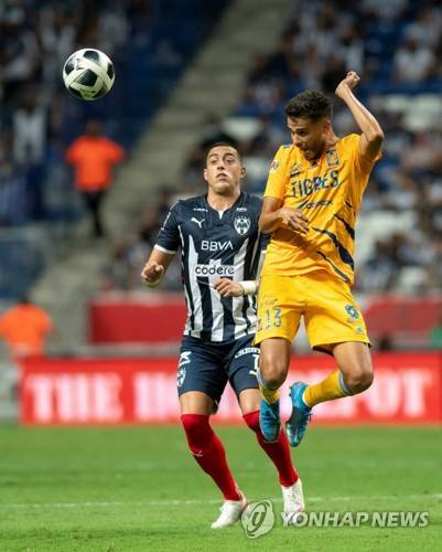 epa09477399 Rogelio Funes Mori (L) of Monterrey in action against Diego Reyes (R) of Tigres UANL during the Liga MX 2021 Apertura Tournament soccer match between Monterrey and Tigres UANL at the BBVA Stadium in Guadalupe, Greater Monterrey, Mexico, 19 September 2021. EPA/MIGUEL SIERRA