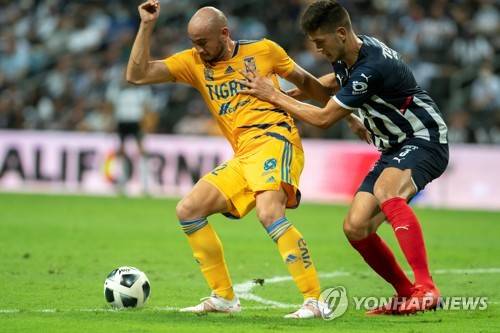 epa09477402 Cesar Montes (R) of Monterrey in action against Carlos Gonzalez (L) of Tigres UANL during the Liga MX 2021 Apertura Tournament soccer match between Monterrey and Tigres UANL at the BBVA Stadium in Guadalupe, Greater Monterrey, Mexico, 19 September 2021. EPA/MIGUEL SIERRA