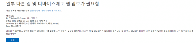 아웃룩·엑스박스360·윈도 폰 등 타 서비스에 로그인하기 위해 패스워드가 필요한 경우가 있다. 이 때 로그인할 수단으로 '앱 암호' 기능이 지원된다. 로그인에 사용될 일회용 패스워드(OTP)를 생성해준다.