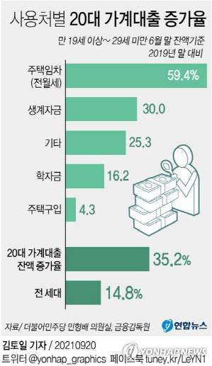 20일 국회 정무위원회 소속 민형배 의원(더불어민주당)이 금융감독원의 자료를 분석한 결과에 따르면, 올해 6월 말 현재 만 19세 이상 만 29세 미만의 은행권 가계대출잔액은 33조4천166억원이다. 이는 코로나19 확산 이전인 2019년 말 24조7천243억원보다 35.2%나 증가한 규모다. 특히 주택임차(전·월세) 용도로 빌린 대출 잔액은 15조4천949억원으로 1년 반 만에 59.4% 늘어났다. 생계자금 대출잔액도 30.0% 늘어 5조6천76억원에 달했다. 이어 기타용도와 학자금 용도 대출이 각각 25.3%, 16.2% 늘어났다. 주택구입용 대출잔액은 5조2천988억원으로, 4.3% 증가했다.