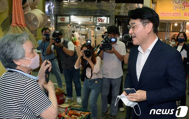 (전주=뉴스1) 유경석 기자 = 박용진 더불어민주당 대선 경선 후보가 20일 전북 전주시 남부시장을 찾아 상인들과 인사를 나누고 있다. 2021.9.20/뉴스1
