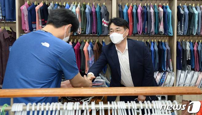 (전주=뉴스1) 유경석 기자 = 박용진 더불어민주당 대선 경선 후보가 20일 전북 전주시 남부시장을 찾아 상인들과 인사를 나누고 있다. 2021.9.20/뉴스1