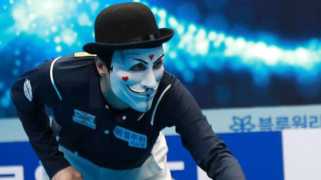 가면으로 얼굴을 가린 '당구 방송인'인 해커가 세계 최강 프레데리크 쿠드롱(웰컴저축은행)을 꺾는 이변을 일으켰습니다.