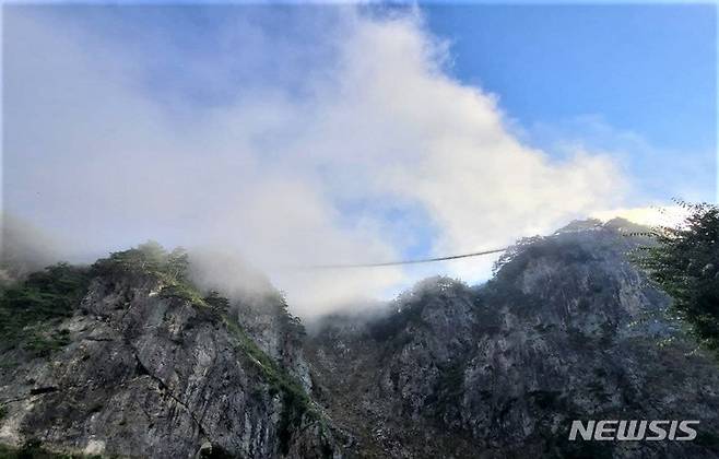 [원주=뉴시스] 이덕화 기자 = 20일 오전 강원 원주시 간현유원지 내 강 안개가 걷히면서 소금산출렁다리가 모습을 보이고 있다. 2021.09.20. wonder8768@newsis.com