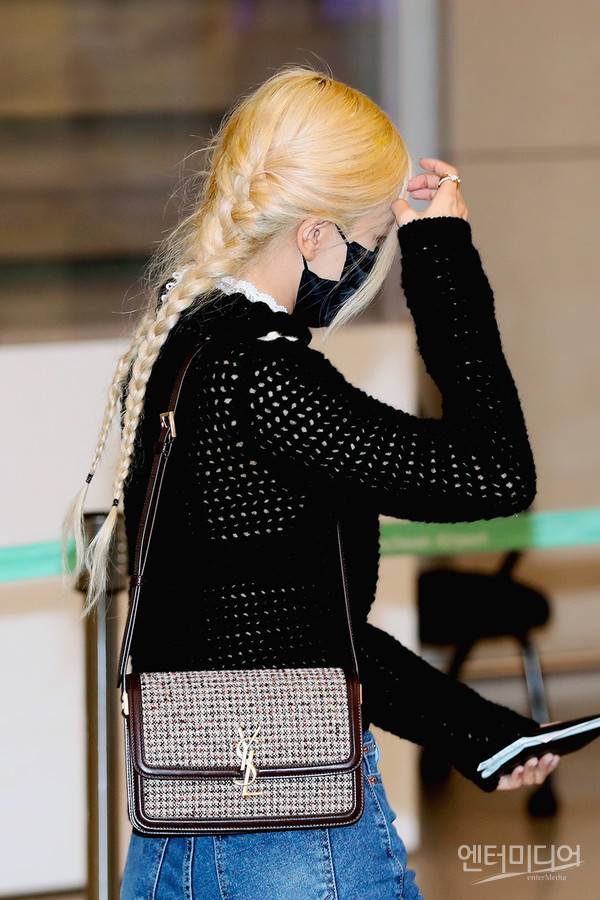 로제 핸드백은 '생로랑 (SAINT LAURENT) 하운즈투스 트위드 소재의 솔페리노(SOLFERINO) 미디엄 사첼백'으로 3,950,000원 이다.