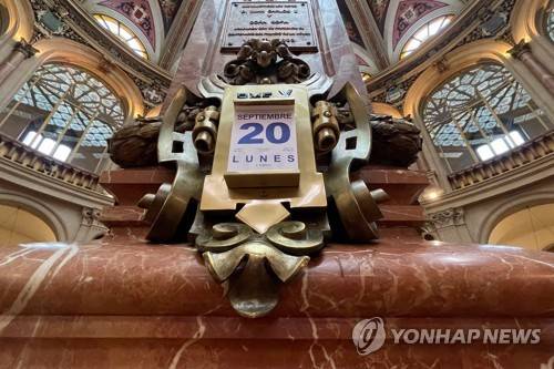 epa09477492 A calendar marks the date at Madrid's Stock Exchange in Madrid, Spain, 20 September 2021. The Spanish stock market maintains losses of 1.30 percent early in the day affected by the significant losses that Hong Kong has registered, dragged by the collapse of the Chinese real estate giant Evergrande, which could enter bankruptcy. EPA/Ana Bornay