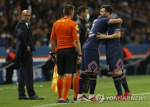 epa09477593 Paris Saint-Germain's Lionel Messi (R) is replaced by teammate Achraf Hakimi (2-R) during the French Ligue 1 soccer match between Paris Saint-Germain (PSG) and Olympique Lyonnais in Paris, France, 19 September 2021 (issued on 20 September 2021). EPA/IAN LANGSDON