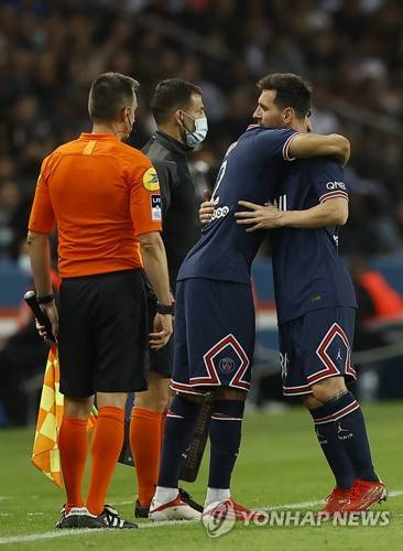 epa09477594 Paris Saint-Germain's Lionel Messi (R) is replaced by teammate Achraf Hakimi (2-R) during the French Ligue 1 soccer match between Paris Saint-Germain (PSG) and Olympique Lyonnais in Paris, France, 19 September 2021 (issued on 20 September 2021). EPA/IAN LANGSDON