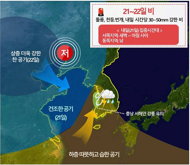 21일은 고도 1.5㎞ 부근의 대기 하층으로 따뜻하고 습한 공기가 남풍을 타고 유입되면서 호남과 경남, 제주를 중심으로 강하고 많은 비가 내리고, 22일에는 따뜻하고 습한 공기는 일본 부근으로 이동하겠으나 북서쪽에서 더욱 찬 공기가 유입되면서 대기가 매우 불안정해져 중부지방에 오전까지 강한 비가 내리는 곳이 있겠다고 기상청은 설명했다.