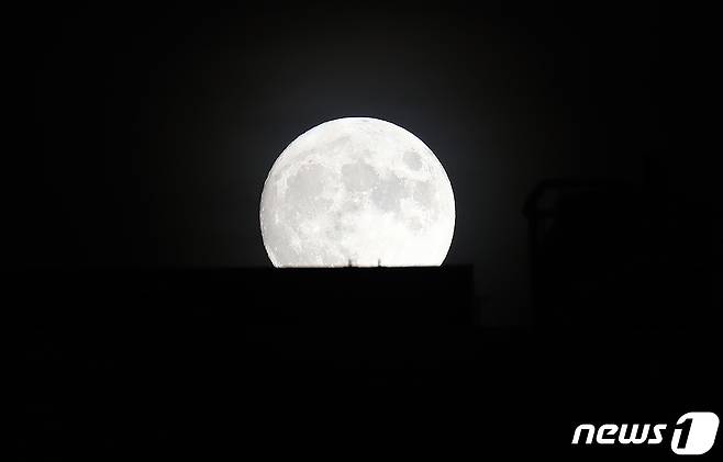 (서울=뉴스1) 박세연 기자 = 추석 하루 전인 20일 오후 서울시내에 보름달이 뜨고 있다. 2021.9.20/뉴스1