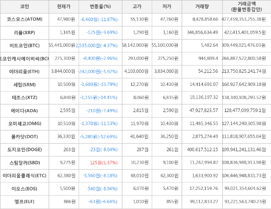 또한, 세럼(-13.79%, 10,500원), 폴카닷(-12.69%, 36,330원), 코스모스(-11.87%, 47,980원), 오미세고(-11.53%, 10,510원), 리플(-9.69%, 1,165원), 이오스(-8.94%, 5,500원), 이더리움클래식(-8.18%, 62,380원), 도지코인(-8.04%, 263원), 에이다(-7.49%, 2,595원), 엘프(-6.64%, 886원), 이더리움(-5.92%, 3,844,000원), 비트코인캐시에이비씨(-2.96%, 275,300원)가 하락세를 나타냈다.