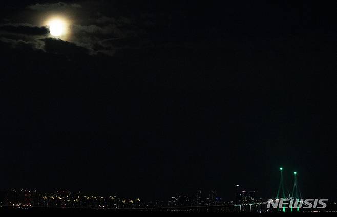 [인천=뉴시스] 정병혁 기자 = 추석 하루 전인 20일 오후 인천 중구 인천대교 위로 보름달이 떠있다. 2021.09.20. jhope@newsis.com
