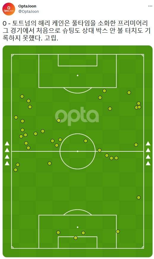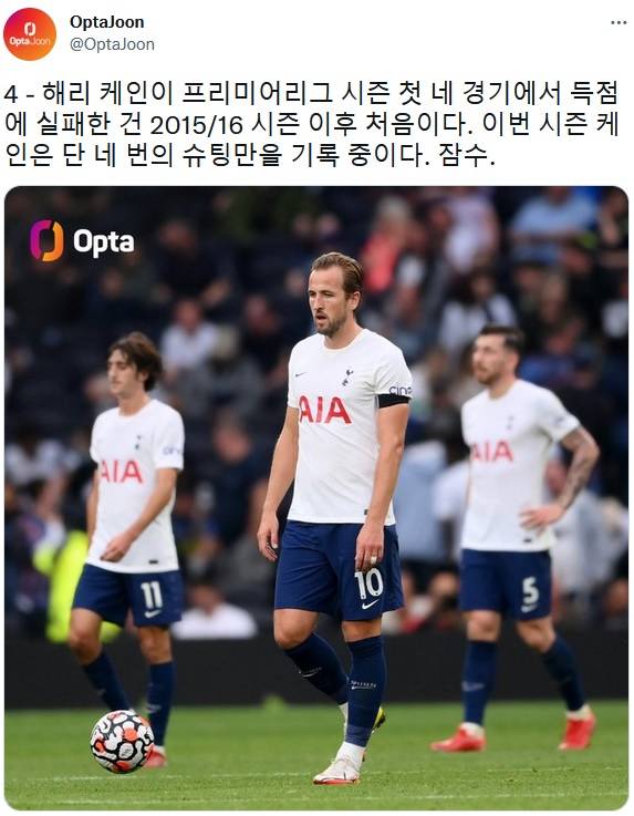 케인은 첼시전에도 무득점에 그치며 이번 시즌 개막 기준 4경기 무득점(개막전은 결장했다)을 기록 중에 있다. 그가 개막 기준 4경기 연속 무득점에 그친 건 2015/16 시즌 이후 6시즌 만에 처음 있는 일이다. 4경기 도합 슈팅 숫자는 4회가 전부이다. 지난 시즌 경기당 3.9회 슈팅을 시도하면서 이 부문 PL 전체 1위를 기록한 선수라고는 믿기지 않는 수치다.