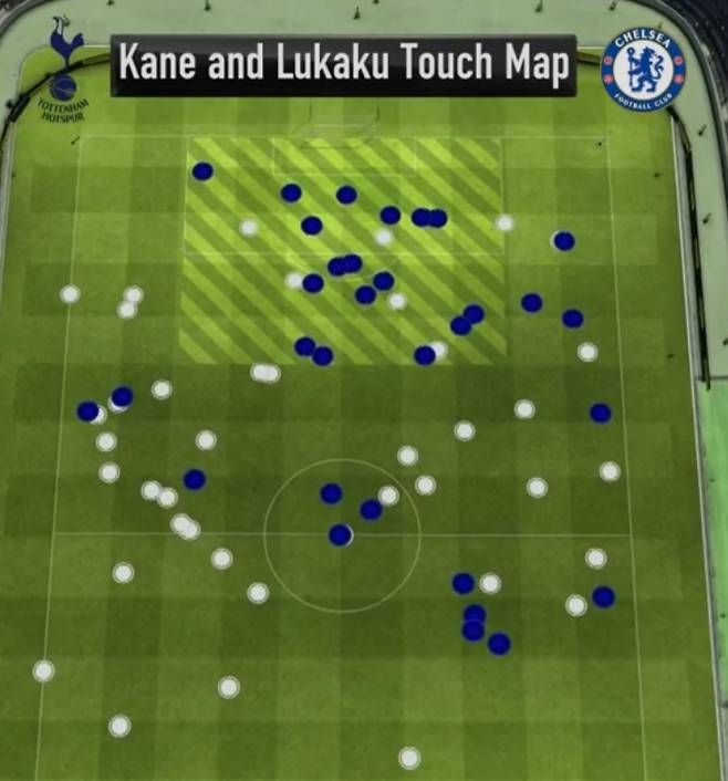 볼터치 역시 미드필더 진영에 대부분을 위치하고 있었다. 이에 영국 공영방송 'BBC'의 PL 경기 리뷰 프로그램 '매치 오브 더 데이(Match of the Day: 줄여서 MOTD)'에 패널로 출연한 잉글랜드의 전설적인 공격수 앨런 시어러는 첼시 공격수 로멜루 루카쿠와 케인의 터치맵을 비교하면서 "루카쿠가 위험 지역(Danger Area: 골대를 기준으로 15m 이내의 거리를 지칭하는 표현. 하단 터치맵에서 표시된 부분)에서 볼터치 17회를 가져가는 동안 케인은 단 5회에 그쳤다"면서 케인의 문제점을 지적하고 나섰다.