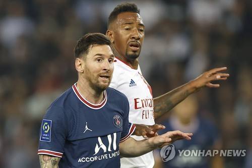 epa09477719 Paris Saint-Germain's Lionel Messi (L) and Lyon's Jerome Boateng (R) react during the French Ligue 1 soccer match between Paris Saint-Germain (PSG) and Olympique Lyonnais in Paris, France, 19 September 2021 (issued on 20 September 2021). EPA/IAN LANGSDON