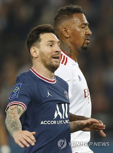 epa09477720 Paris Saint-Germain's Lionel Messi (L) and Lyon's Jerome Boateng (R) react during the French Ligue 1 soccer match between Paris Saint-Germain (PSG) and Olympique Lyonnais in Paris, France, 19 September 2021 (issued on 20 September 2021). EPA/IAN LANGSDON