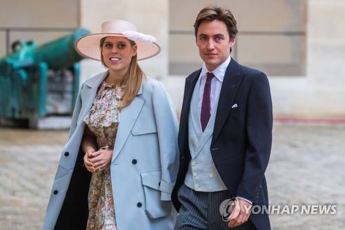 epa09477725 (FILE) - Britain's Princess Beatrice of York (L) and Edoardo Mapelli Mozzi (R) arrive for the wedding ceremony of the Prince Napoleon Countess Arco-Zinneberg at the Saint-Louis-des-Invalides cathedral at the Invalides National Hotel in Paris, France, 19 October 2019 (reissued 20 September 2021). According to the Buckingham Palace, the daughter of the Duke and Duchess of York, Princess Beatrice gave birth to a baby girl on 18 September, which is the Queen Elizabeth's 12th great-grandchild. EPA/CHRISTOPHE PETIT TESSON *** Local Caption *** 56910018