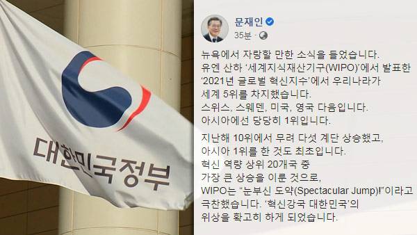 문재인 대통령은 유엔 산하 세계지식재산기구가 발표한 '2021년 글로벌 혁신지수'에서 우리나라가 세계 5위를 차지한 것과 관련해 "코로나 등 안팎으로 어려운 여건 속에서 우리의 과감한 혁신과 미래 준비가 이룬 성과"라고 평가했습니다.