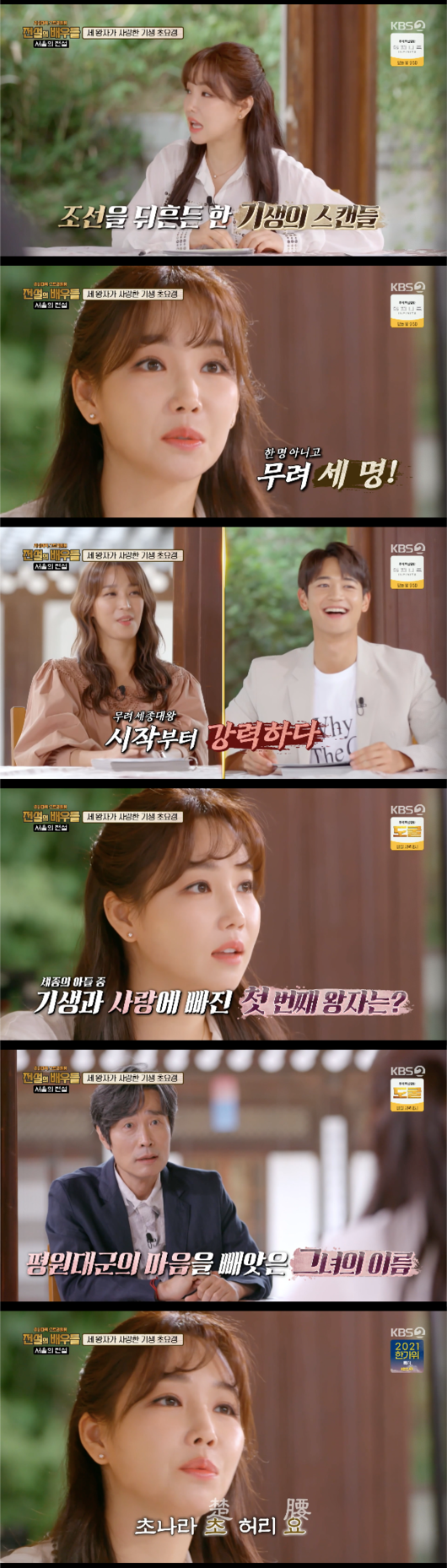 이유리는 “조선을 뒤흔든 기생의 어마어마한 스캔들에 관한 이야기다. 이 기생한테 빠져든 사람 중 왕족도 있었다. 무려 세 명이었는데 이 왕족 세 분의 아버지가 조선 4대 왕 세종대왕이었다”고 말했다. 반응꾼 이재용은 “그런 성군이면 자식 교육을 예사로 하지 않았을텐데..”라며 탄식했다.