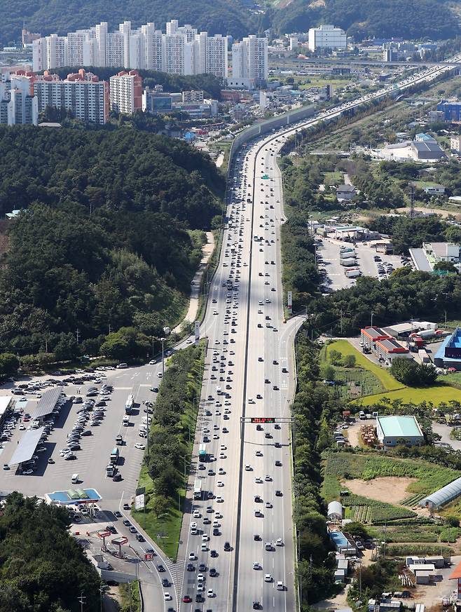 한국도로공사에 따르면 이날 9시 10분 기준 경부고속도로 부산 방향은 한남∼서초 4㎞ 구간에서만 정체를 빚고 있다. 서울 방향은 안성 부근∼남사, 서초∼반포 총 6㎞ 구간에서 차들이 제 속도를 내지 못하고 있다.