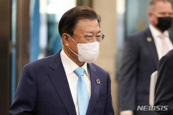 [뉴욕=AP/뉴시스] 문재인 대통령이 20일(현지시간) 미국 뉴욕에서 열린 제76차 유엔 총회가 열리는 유엔본부에 도착하고 있다. 2021.09.20.