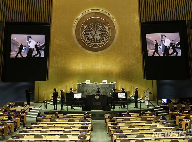 [뉴욕=AP/뉴시스] 20일(현지시간) 뉴욕 유엔본부에서 열린 제76차 유엔 총회에서 한국의 K팝 그룹 방탄소년단(BTS) 멤버들이 발언 후 총회홀 모니터에 나오는 뮤직비디오를 시청하고 있다. 2021.09.20.