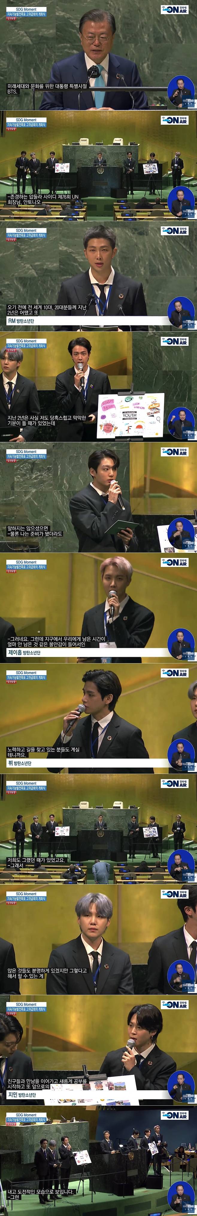 9월 20일 오후 9시(한국시간) 미국 뉴욕에서 유엔(UN) 사무총장 주재 아래 제76차 유엔 총회 특별행사 '지속가능발전목표(SDG) 모멘트' 개회 세션이 진행됐다. 방탄소년단은 대통령 특사 임명 후 첫 공식 일정인 이번 세션에서 청년세대, 미래세대 대표로서 연설을 펼쳤다.