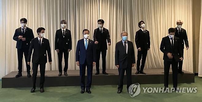 (뉴욕=연합뉴스) 문재인 대통령이 20일(현지시각) 뉴욕 유엔본부 총회장에서 열린 제2차 SDG Moment(지속가능발전목표 고위급회의) 개회식 참석에 앞서 그룹 BTS(방탄소년단)와 기념촬영을 하고 있다. 오른쪽 네번째는 안토니우 구테흐스 유엔 사무총장. 2021.9.20. [청와대 제공. 재판매 및 DB 금지]