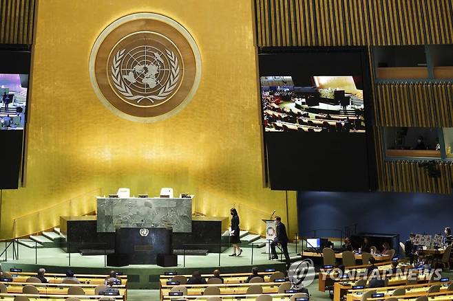 (뉴욕=연합뉴스) 최재구 기자 = 문재인 대통령이 20일(현지시각) 뉴욕 유엔본부 총회장에서 열린 제2차 SDG Moment(지속가능발전목표 고위급회의) 개회식에서 발언을 위해 연단으로 이동하고 있다. 2021.9.20