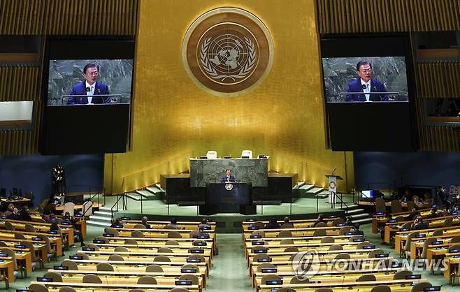 (뉴욕=연합뉴스) 최재구 기자 = 문재인 대통령이 20일(현지시각) 뉴욕 유엔본부 총회장에서 열린 제2차 SDG Moment(지속가능발전목표 고위급회의) 개회식에서 발언하고 있다. 2021.9.20
