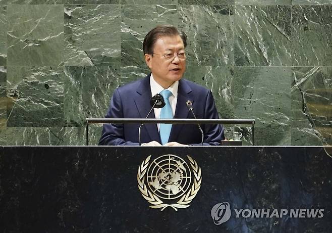 (뉴욕=연합뉴스) 최재구 기자 = 문재인 대통령이 20일(현지시각) 뉴욕 유엔본부 총회장에서 열린 제2차 SDG Moment(지속가능발전목표 고위급회의) 개회식에서 발언하고 있다. 2021.9.20
