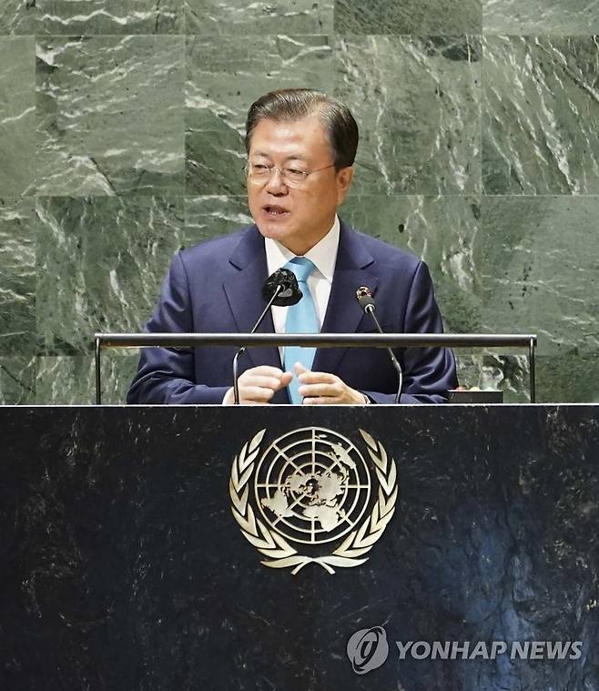 (뉴욕=연합뉴스) 최재구 기자 = 문재인 대통령이 20일(현지시각) 뉴욕 유엔본부 총회장에서 열린 제2차 SDG Moment(지속가능발전목표 고위급회의) 개회식에서 발언하고 있다. 2021.9.20