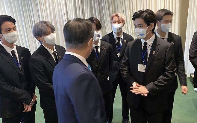 [뉴욕(미국)=뉴시스] 문재인 대통령과 그룹 방탄소년단(BTS)이 20일(현지시간) 뉴욕 유엔본부에서 열린 SDG Moment(지속가능발전목표 고위급회의) 개회 세션 참석에 앞서 대화하고 있다. (사진=청와대 제공) 2021.09.20. photo@newsis.com *재판매 및 DB 금지