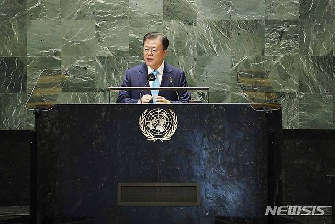 [뉴욕=뉴시스] 김진아 기자 = 문재인 대통령이 20일(현지시간) 미국 뉴욕 유엔본부 총회장에서 열린 제2차 SDG Moment(지속가능발전목표 고위급회의) 개회식에서 발언하고 있다. 2021.09.20. bluesoda@newsis.com