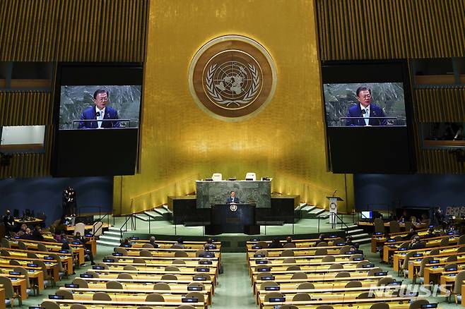 [뉴욕=뉴시스] 김진아 기자 = 문재인 대통령이 20일(현지시간) 미국 뉴욕 유엔본부 총회장에서 열린 제2차 SDG Moment(지속가능발전목표 고위급회의) 개회식에서 연설하고 있다. 2021.09.20. bluesoda@newsis.com