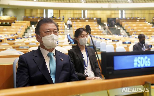 [뉴욕=뉴시스] 김진아 기자 = 문재인 대통령이 20일(현지시간) 미국 뉴욕 유엔본부 총회장에서 열린 제2차 SDG Moment(지속가능발전목표 고위급회의) 개회식에 참석해 있다. 2021.09.20. bluesoda@newsis.com