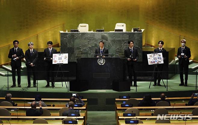[뉴욕=뉴시스] 김진아 기자 = 그룹 BTS(방탄소년단)이 20일(현지시간) 미국 뉴욕 유엔본부 총회장에서 열린 제2차 SDG Moment(지속가능발전목표 고위급회의) 개회식에서 발언하고 있다. 2021.09.20. bluesoda@newsis.com