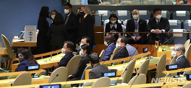 [뉴욕=뉴시스] 김진아 기자 = 문재인 대통령이 20일(현지시간) 미국 뉴욕 유엔본부 총회장에서 열린 제2차 SDG Moment(지속가능발전목표 고위급회의) 개회식에 참석해 있다. 2021.09.20. bluesoda@newsis.com